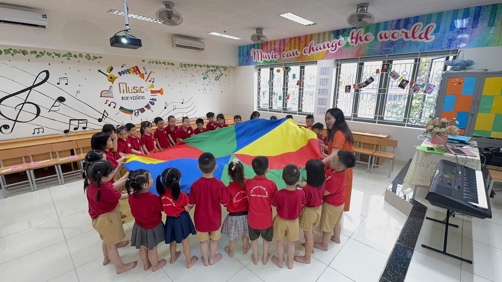 Các con tham quan và trải nghiệm phòng âm nhạc