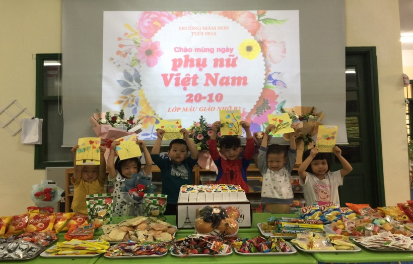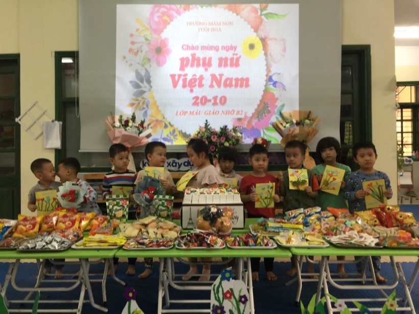Ngày phụ nữ Việt Nam là ngày nhằm tôn vinh người phụ nữ Việt Nam. Lớp mẫu giáo nhỡ B2 đã tổ chức cho các con làm những chiếc bưu thiếp tặng bà, tặng mẹ đầy ý nghĩa . Bạn nào cũng phấn khởi, vui mừng mang món quà xinh xắn do tự tay mình làm ra và những lời chúc ý nghĩa để kính tặng bà, tặng mẹ.