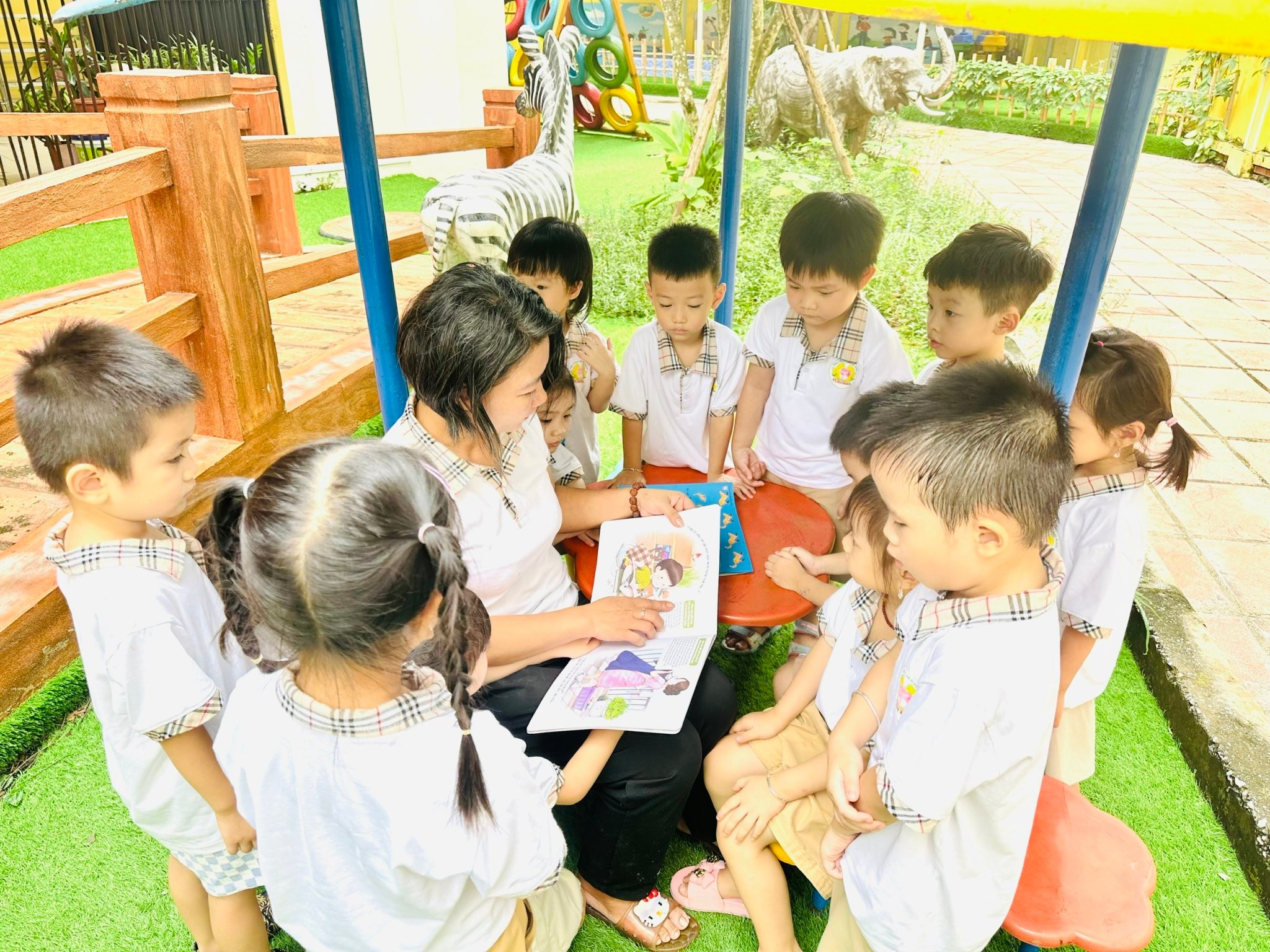 Cô đọc chuyện cho các bạn nhỏ lăng nghe rất chăm chú
