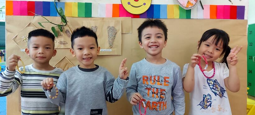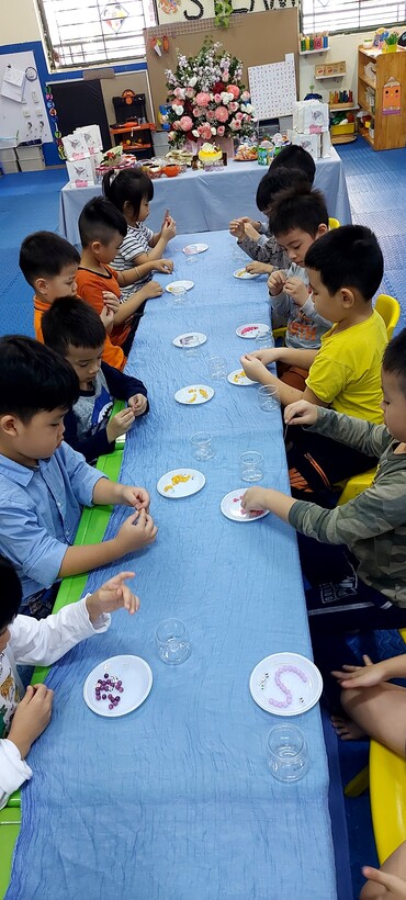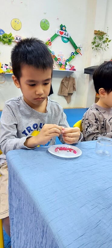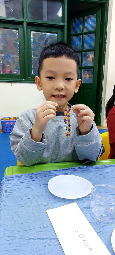 Qua hoạt động xâu vòng với chủ đề "Vòng tay yêu thương" các con đã khéo léo xâu các hột hạt nhiều màu sắc để tạo thành các chuỗi vòng tay xinh xắn, đẹp đẽ chứa đựng tình cảm yêu thương vô bờ bến, lòng biết ơn sâu sắc dành tặng cho những người bà, người mẹ kính yêu của mình. Bên cạnh đó, các con còn tạo ra những chiếc bưu thiếp vô cùng đáng yêu thay cho những bó hoa tươi thắm để dành tặng cho bà, cho mẹ. Dưới đây là một số hình ảnh ngộ nghĩnh của các con về các hoạt động trong ngày này.
