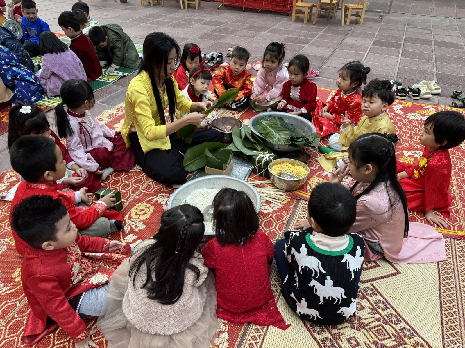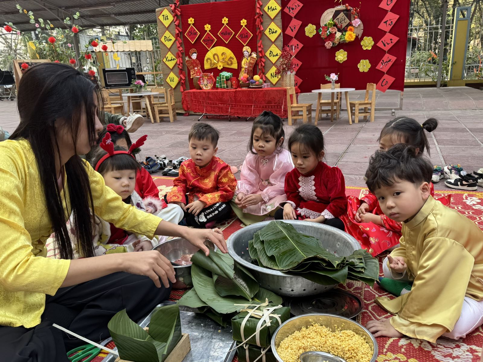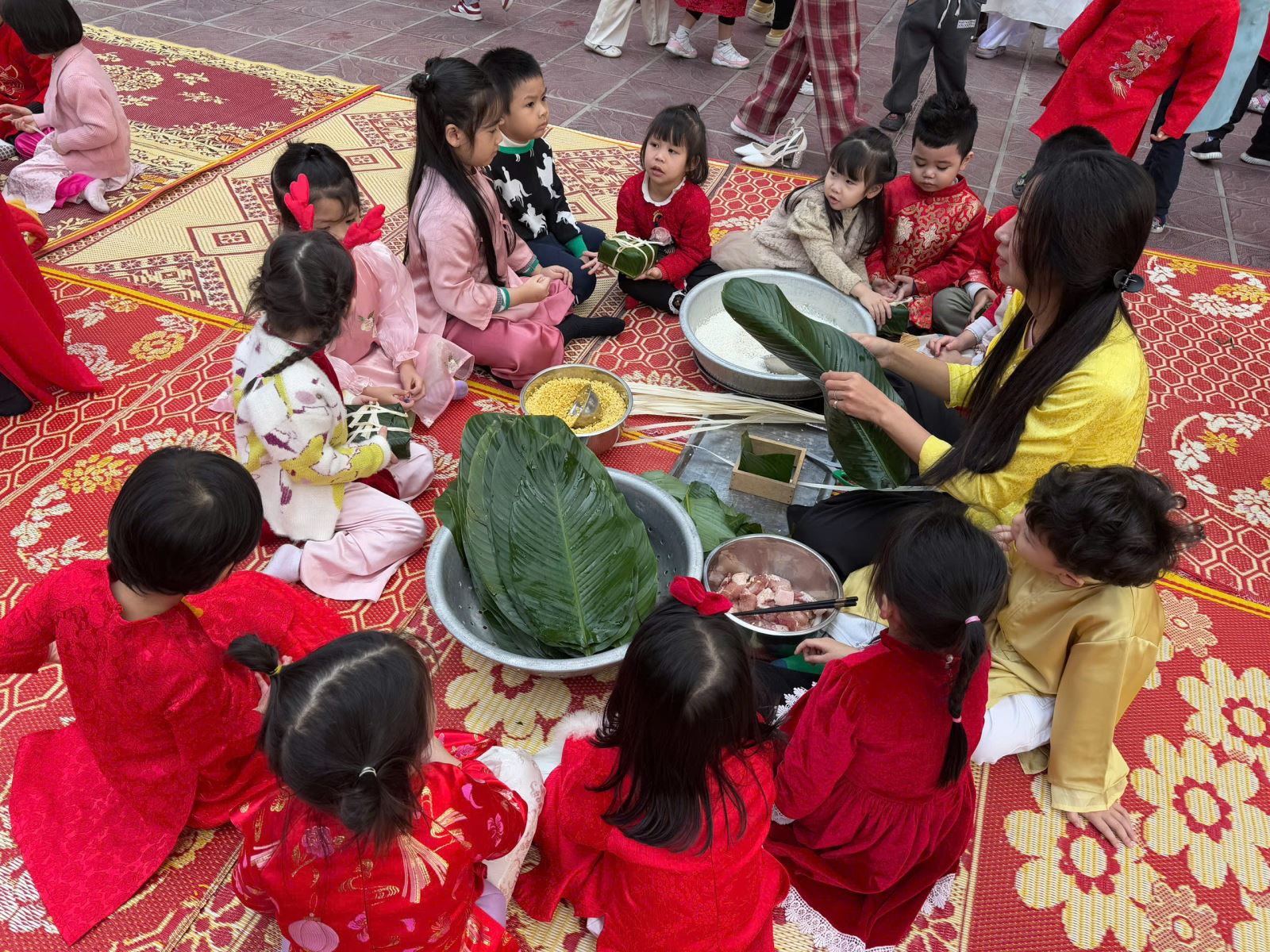 Các bạn nhỏ lớp mẫu giáo nhỡ B2 tham gia "Lễ hội gói bánh chưng" tại trường mầm non Tuổi Hoa