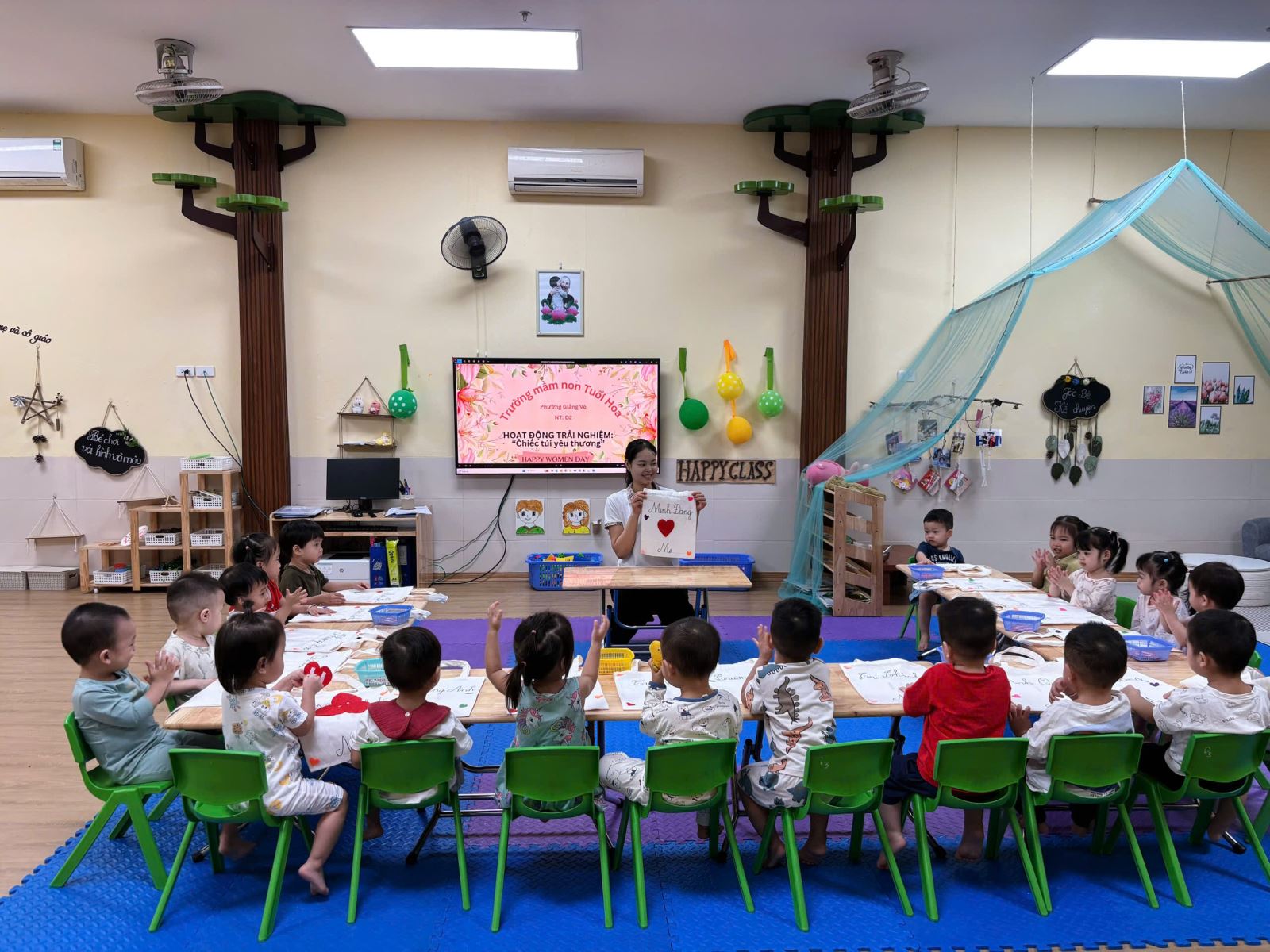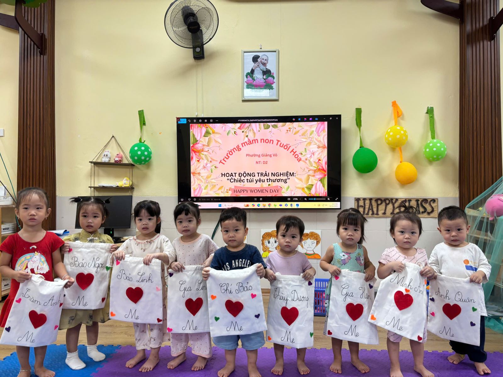 Nhân dịp 20/10 – ngày tôn vinh những người phụ nữ Việt Nam, các bé lớp nhà trẻ D2 tại Trường Mầm non Mầm Non Tuổi Hoa Giảng Võ đã có một hoạt động trải nghiệm vô cùng ý nghĩa mang tên “Chiếc túi yêu thương tặng mẹ”.