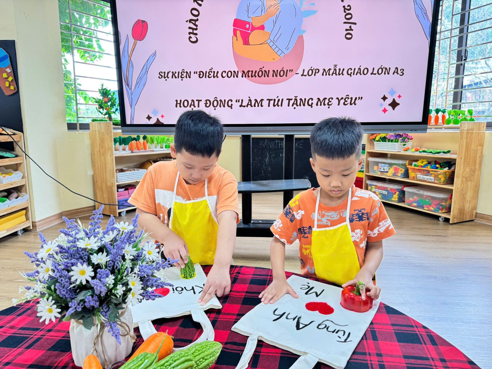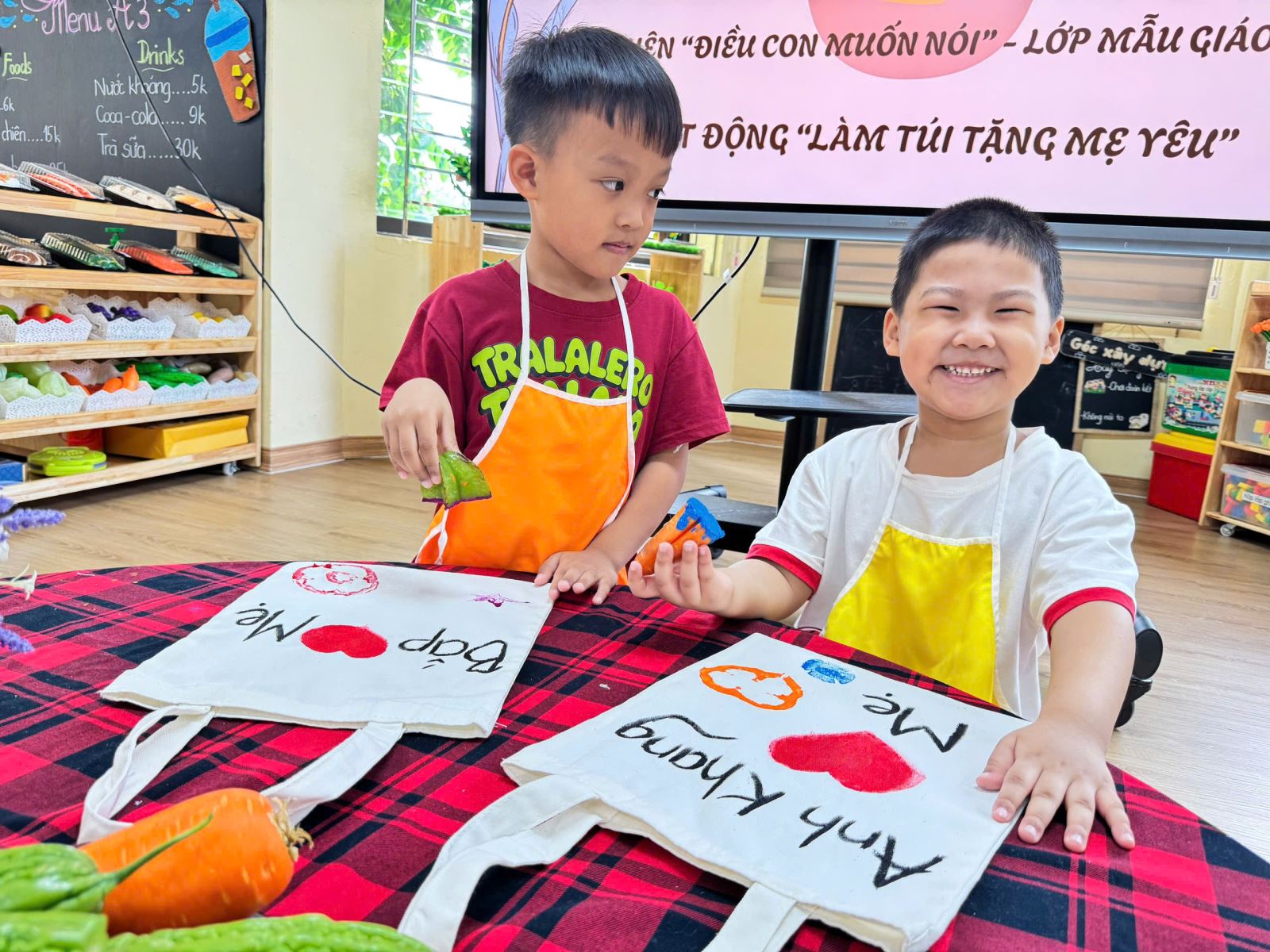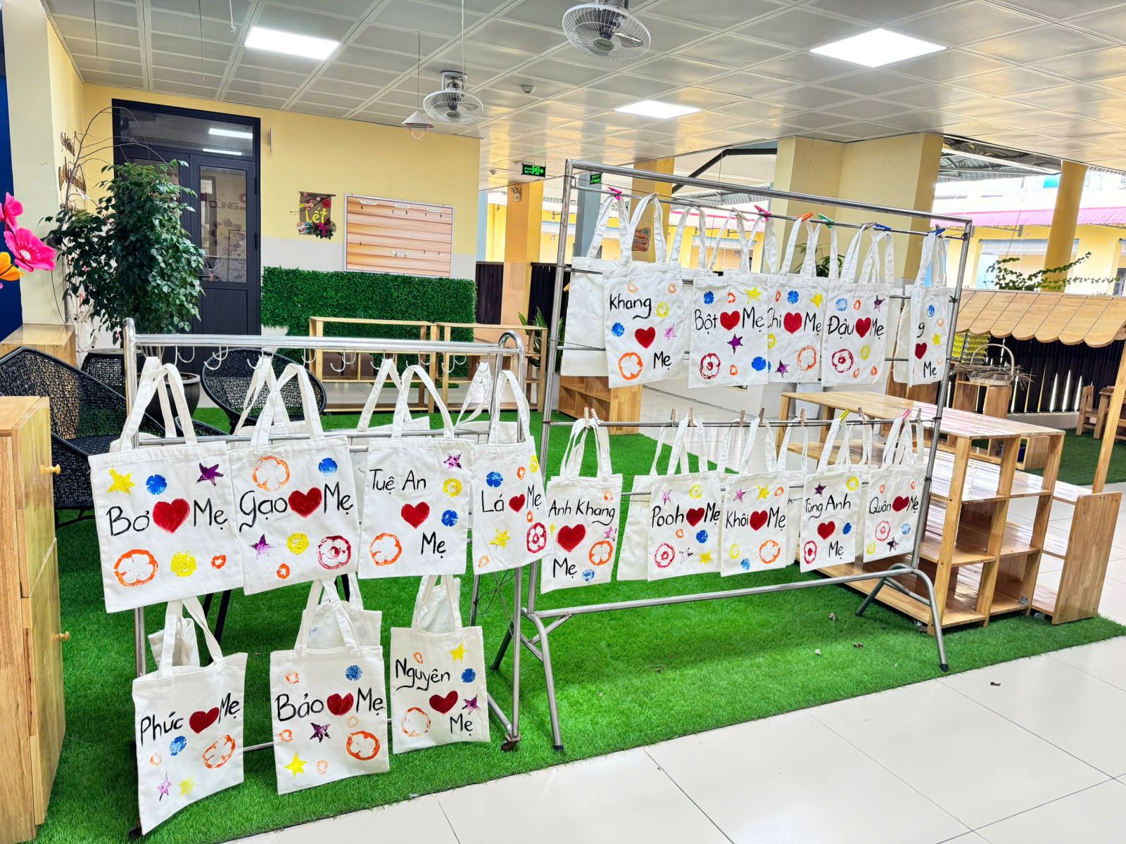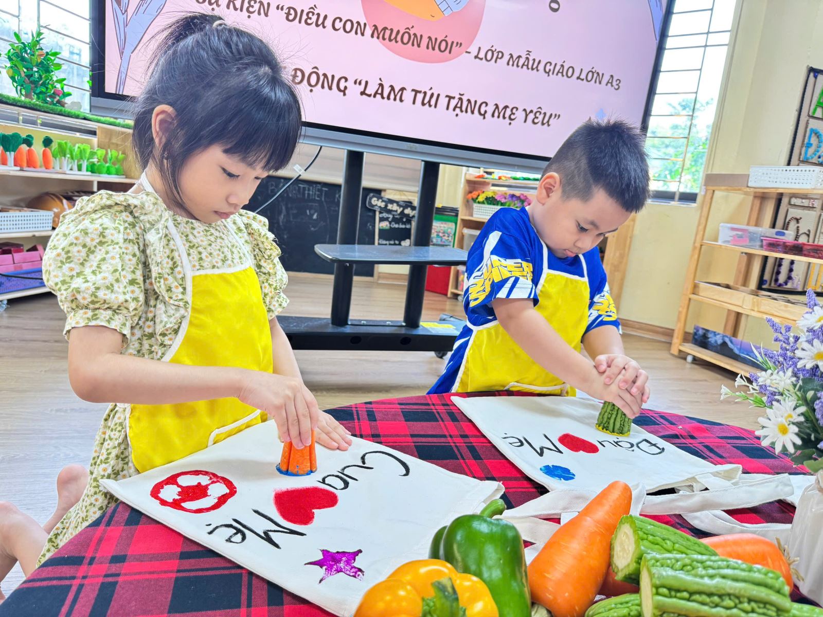 Với đôi bàn tay nhỏ nhắn, các con say sưa trang trí những chiếc túi vải bằng màu sắc rực rỡ, họa tiết ngộ nghĩnh và đầy sáng tạo được tạo hình từ những rau, củ quả hằng ngày mà các con được tiếp xúc trong cuộc sống. Mỗi chiếc túi là một tác phẩm độc đáo, chứa đựng trong đó tình yêu thương và lòng biết ơn mà các con muốn gửi đến người mẹ thân yêu của mình.