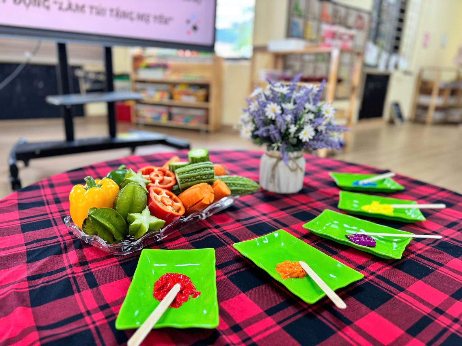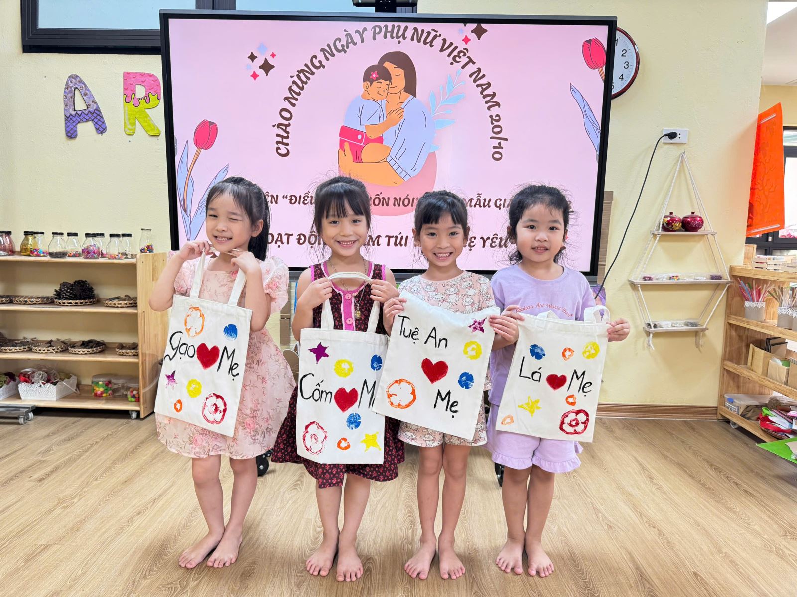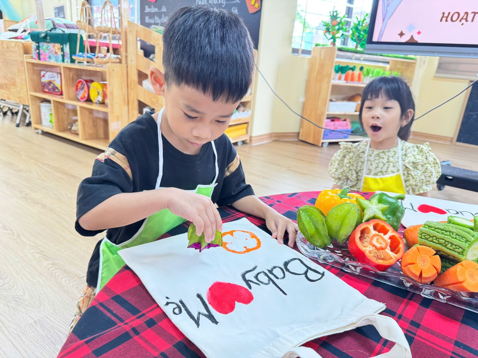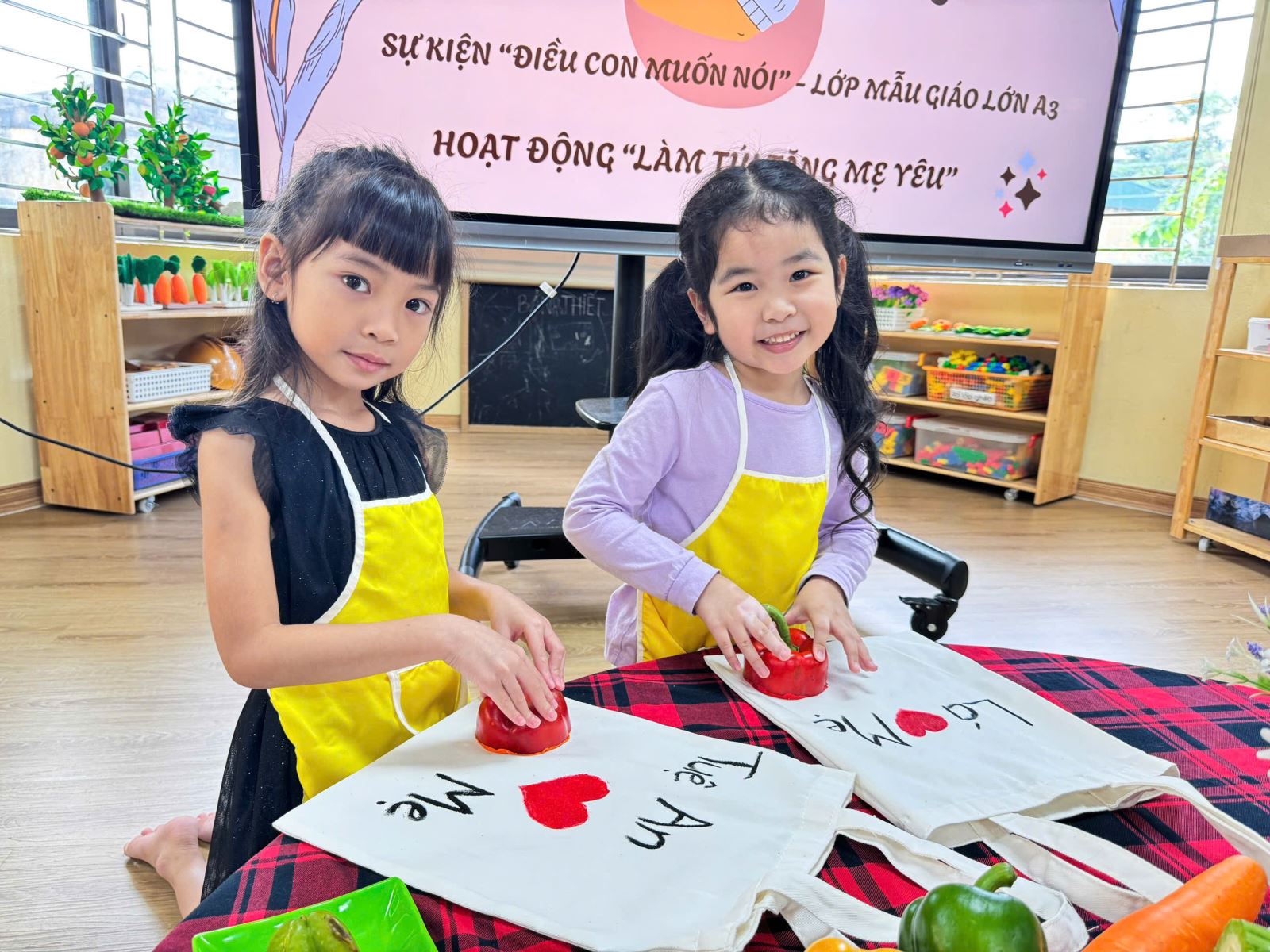 Với đôi bàn tay nhỏ nhắn, các con say sưa trang trí những chiếc túi vải bằng màu sắc rực rỡ, họa tiết ngộ nghĩnh và đầy sáng tạo được tạo hình từ những rau, củ quả hằng ngày mà các con được tiếp xúc trong cuộc sống. Mỗi chiếc túi là một tác phẩm độc đáo, chứa đựng trong đó tình yêu thương và lòng biết ơn mà các con muốn gửi đến người mẹ thân yêu của mình.