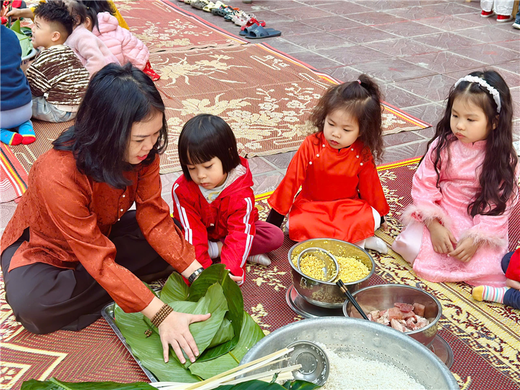 Cô giáo hướng dẫn bé cách gói bánh chưng