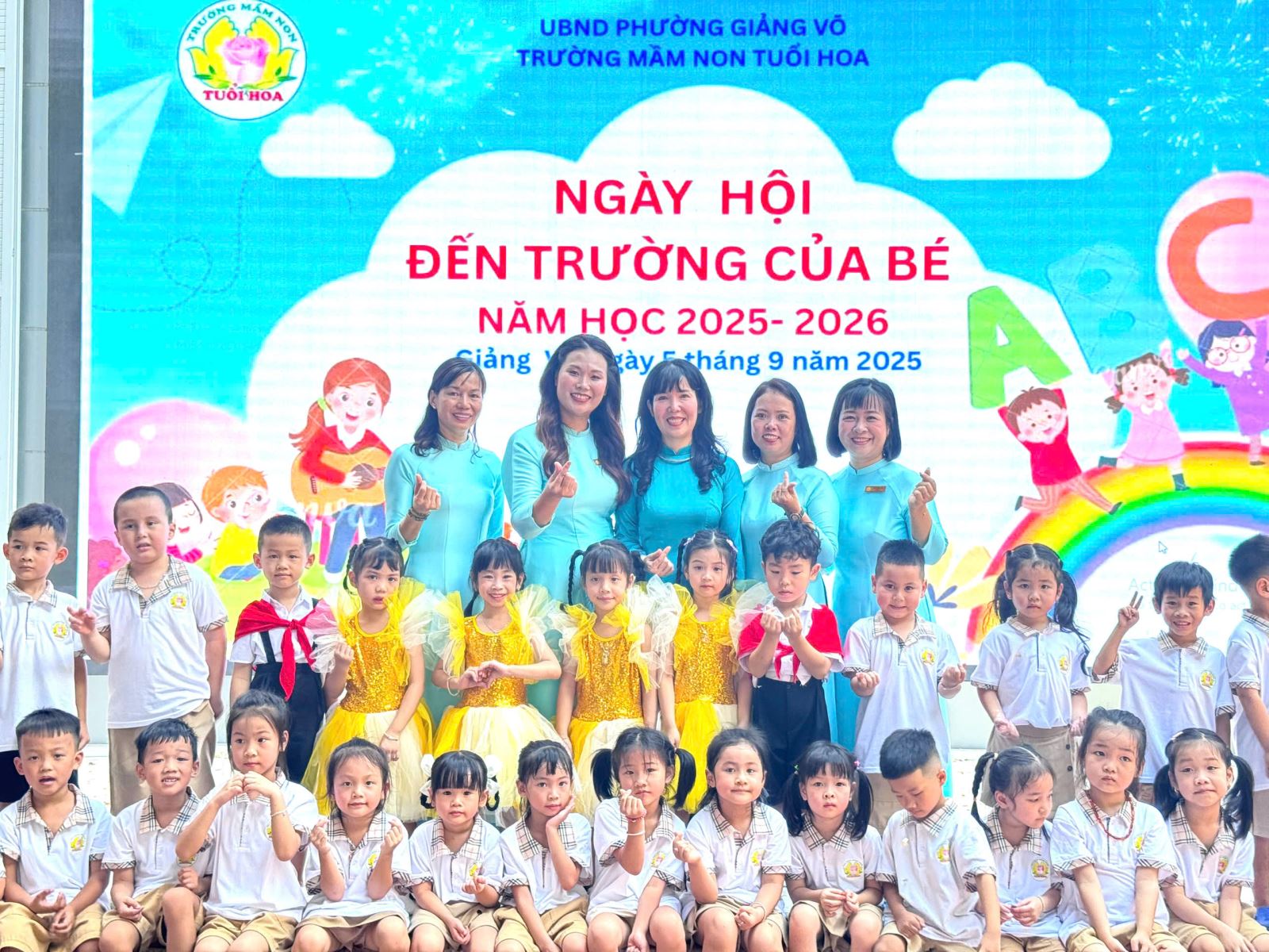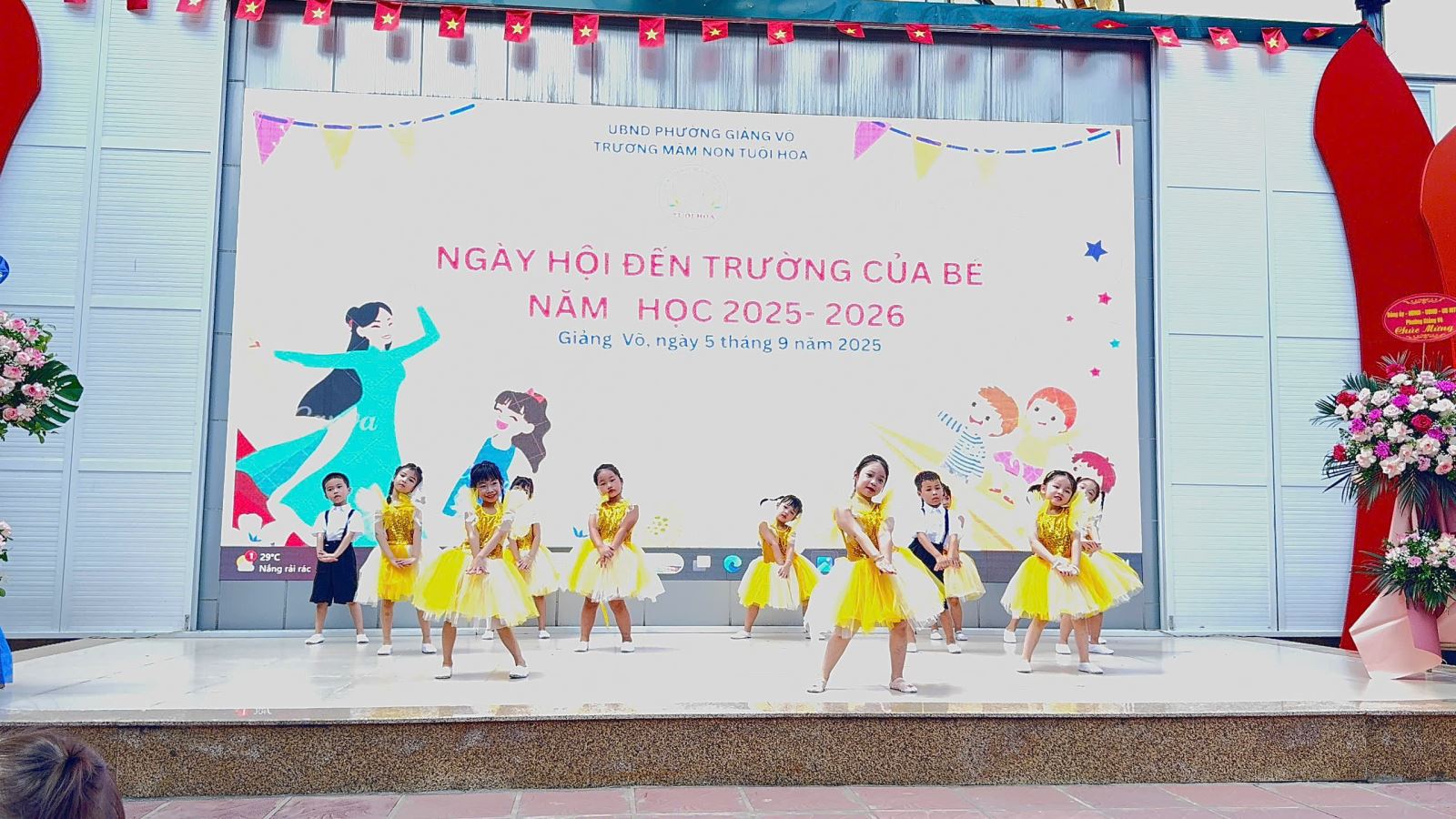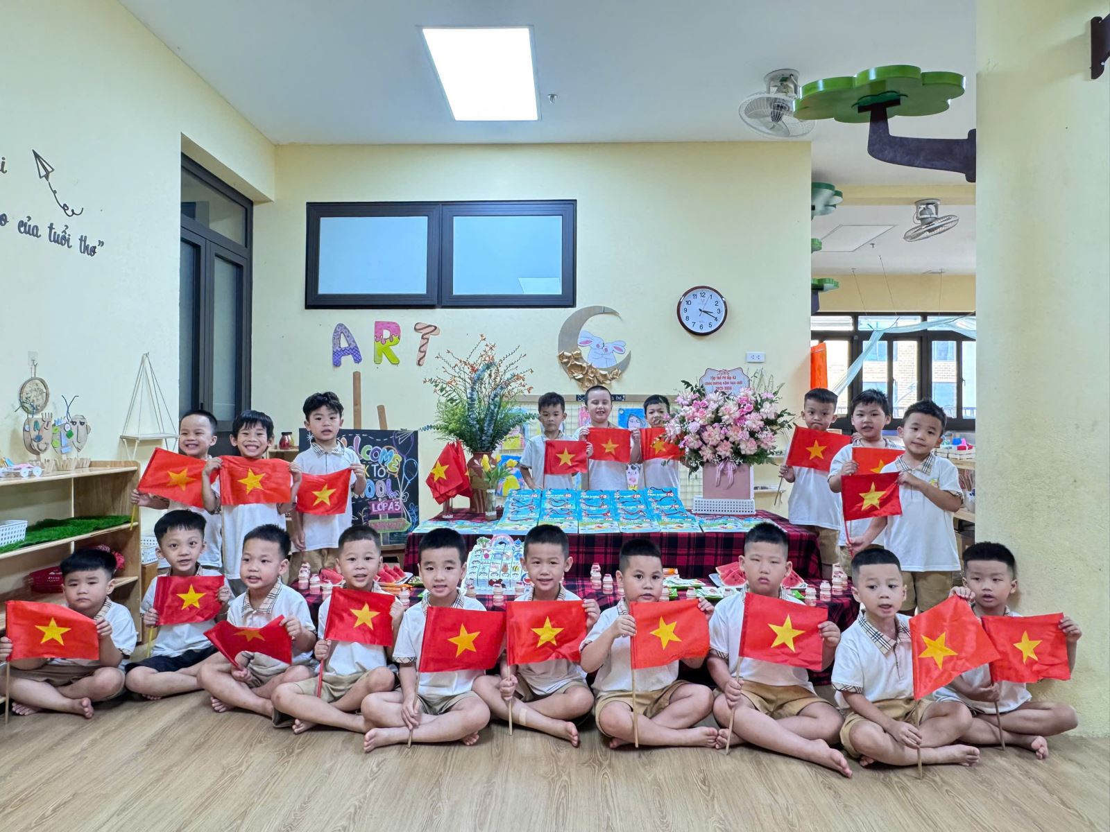 Hòa chung không khí phấn khởi ấy, sáng nay lễ khai giảng tại trường Mầm non Tuổi Hoa thật rộn ràng và xúc động. Đây là lần đầu tiên trong lịch sử, lễ khai giảng được tổ chức long trọng và được truyền hình trực tiếp trên cả nước để hàng triệu con tim cùng hướng về một khoảnh khắc thiêng liêng, khoảnh khắc của tri thức, của niềm tin và của hi vọng. Ngay từ sáng sớm, tiếng vỗ tay giòn giã cùng sắc cờ hoa đã làm sân trường ngập tràn niềm vui. Tại buổi lễ, các con được hòa mình vào các tiết mục văn nghệ đặc sắc, sôi động.