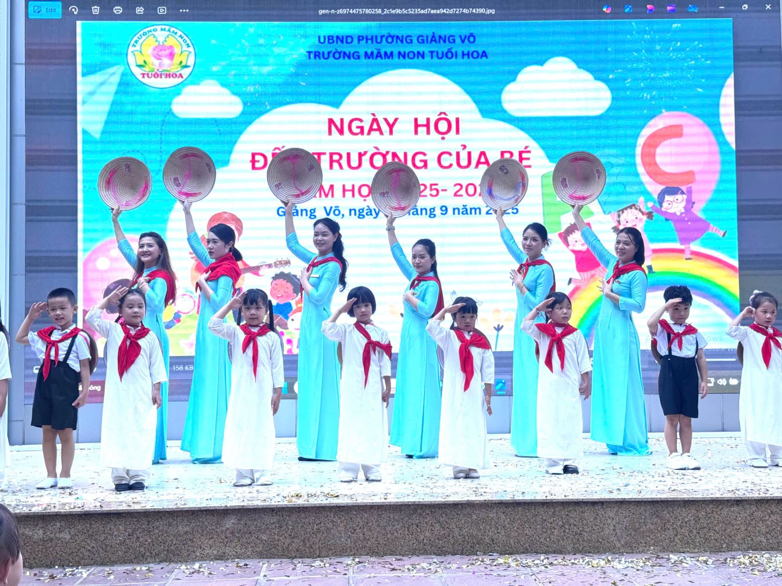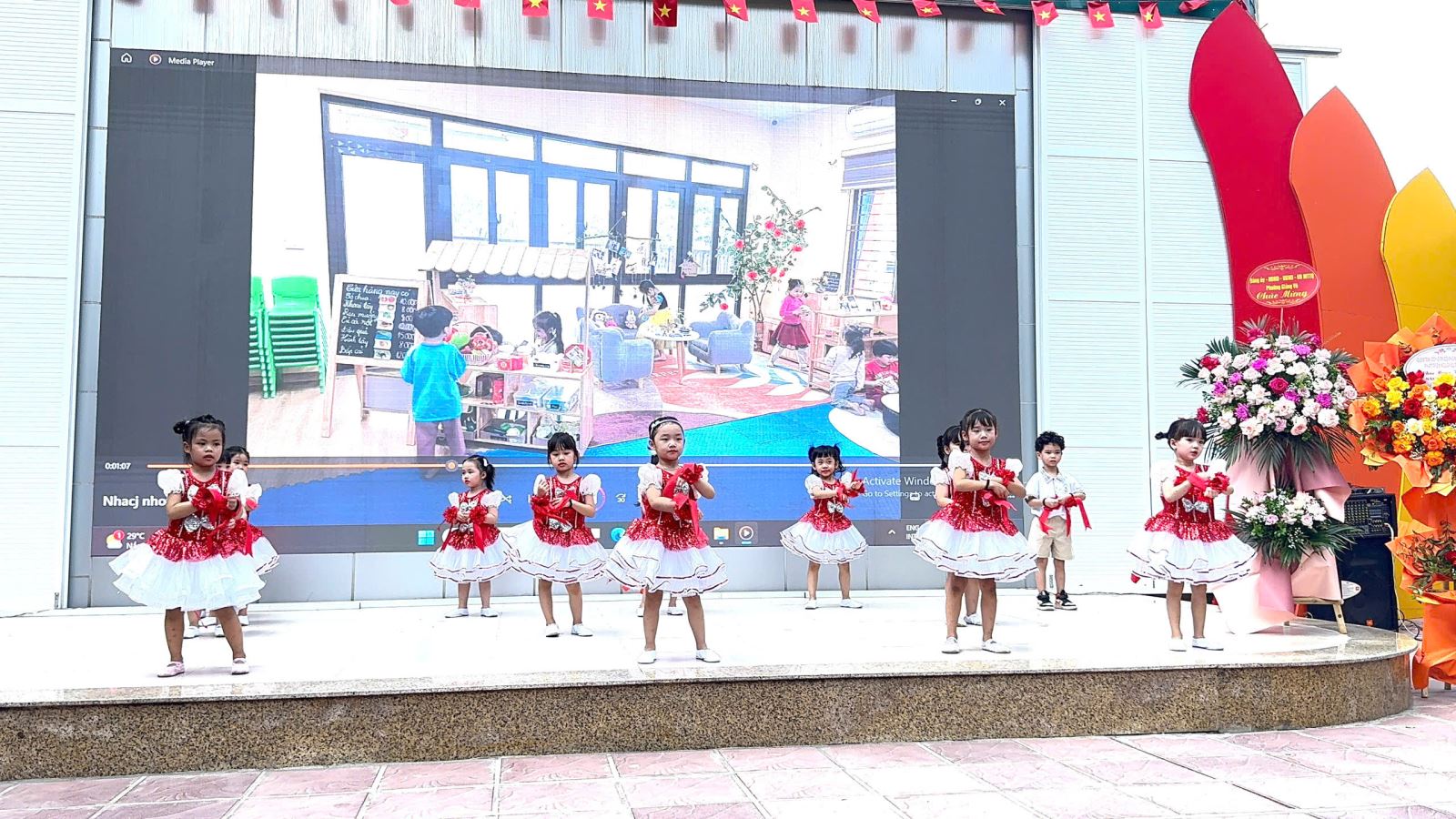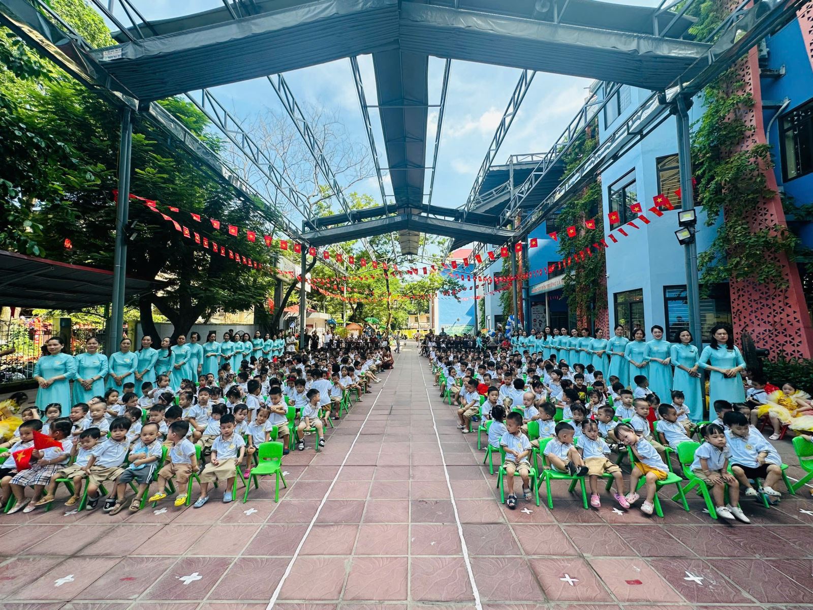 Hòa chung không khí phấn khởi ấy, sáng nay lễ khai giảng tại trường Mầm non Tuổi Hoa thật rộn ràng và xúc động. Đây là lần đầu tiên trong lịch sử, lễ khai giảng được tổ chức long trọng và được truyền hình trực tiếp trên cả nước để hàng triệu con tim cùng hướng về một khoảnh khắc thiêng liêng, khoảnh khắc của tri thức, của niềm tin và của hi vọng. Ngay từ sáng sớm, tiếng vỗ tay giòn giã cùng sắc cờ hoa đã làm sân trường ngập tràn niềm vui. Tại buổi lễ, các con được hòa mình vào các tiết mục văn nghệ đặc sắc, sôi động.