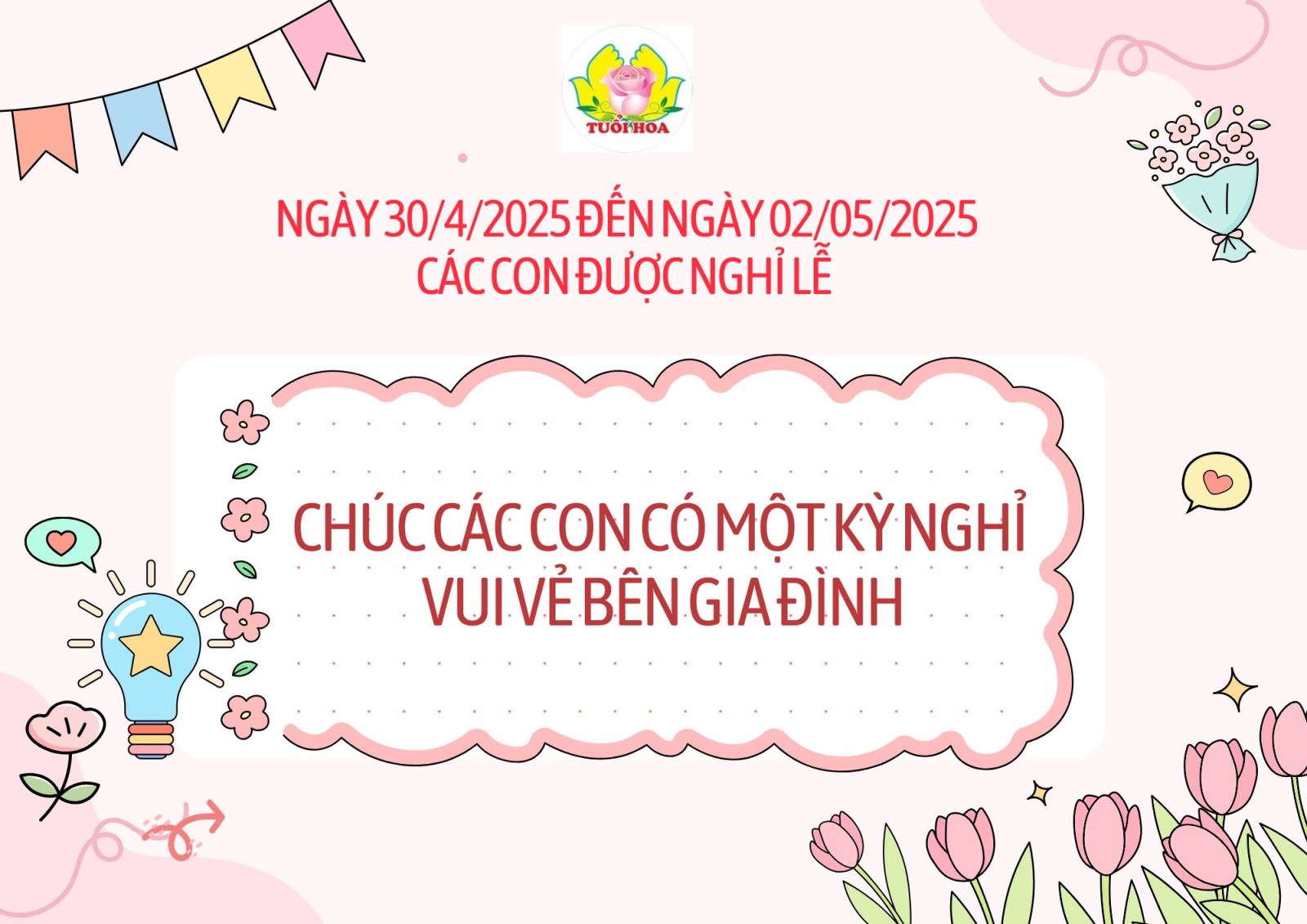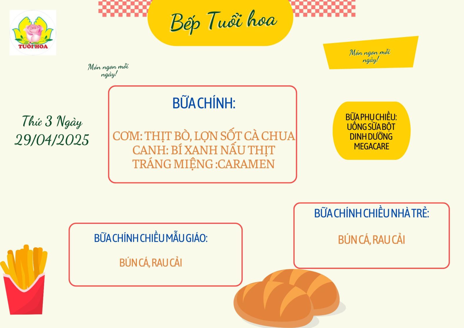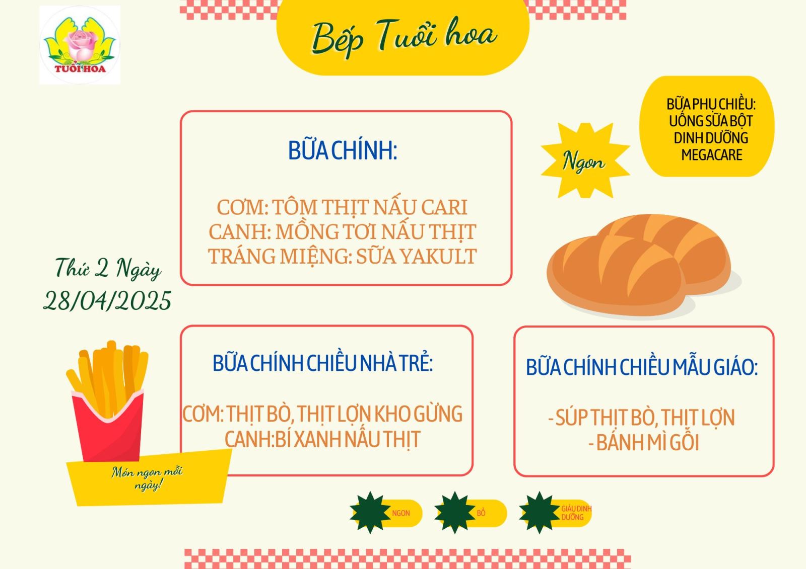Chào mừng quý phụ huynh đến với thực đơn dinh dưỡng tháng 4 tuần 5 từ ngày 28/04/2025 đến ngày 02/05/2025 của trường mầm non Tuổi Hoa! Chúng tôi luôn nỗ lực mang đến những bữa ăn không chỉ ngon miệng mà còn đảm bảo đầy đủ dinh dưỡng, giúp các bé phát triển toàn diện cả về thể chất lẫn trí tuệ.