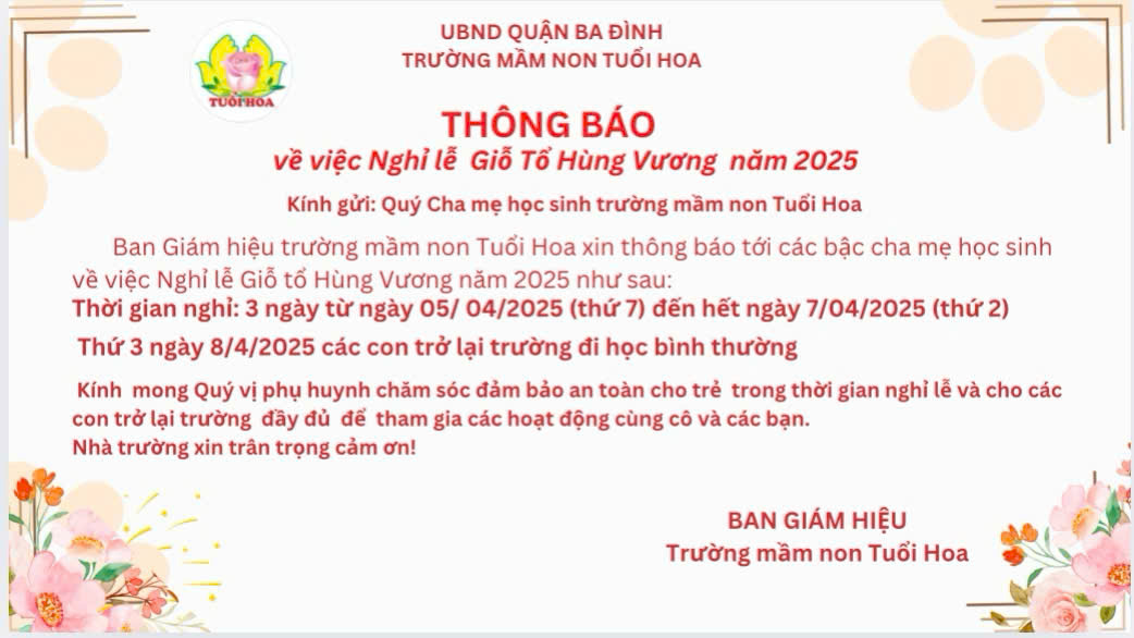 Trường mầm non Tuổi Hoa thông báo lịch nghỉ lễ Giỗ tổ Hùng Vương năm 2025