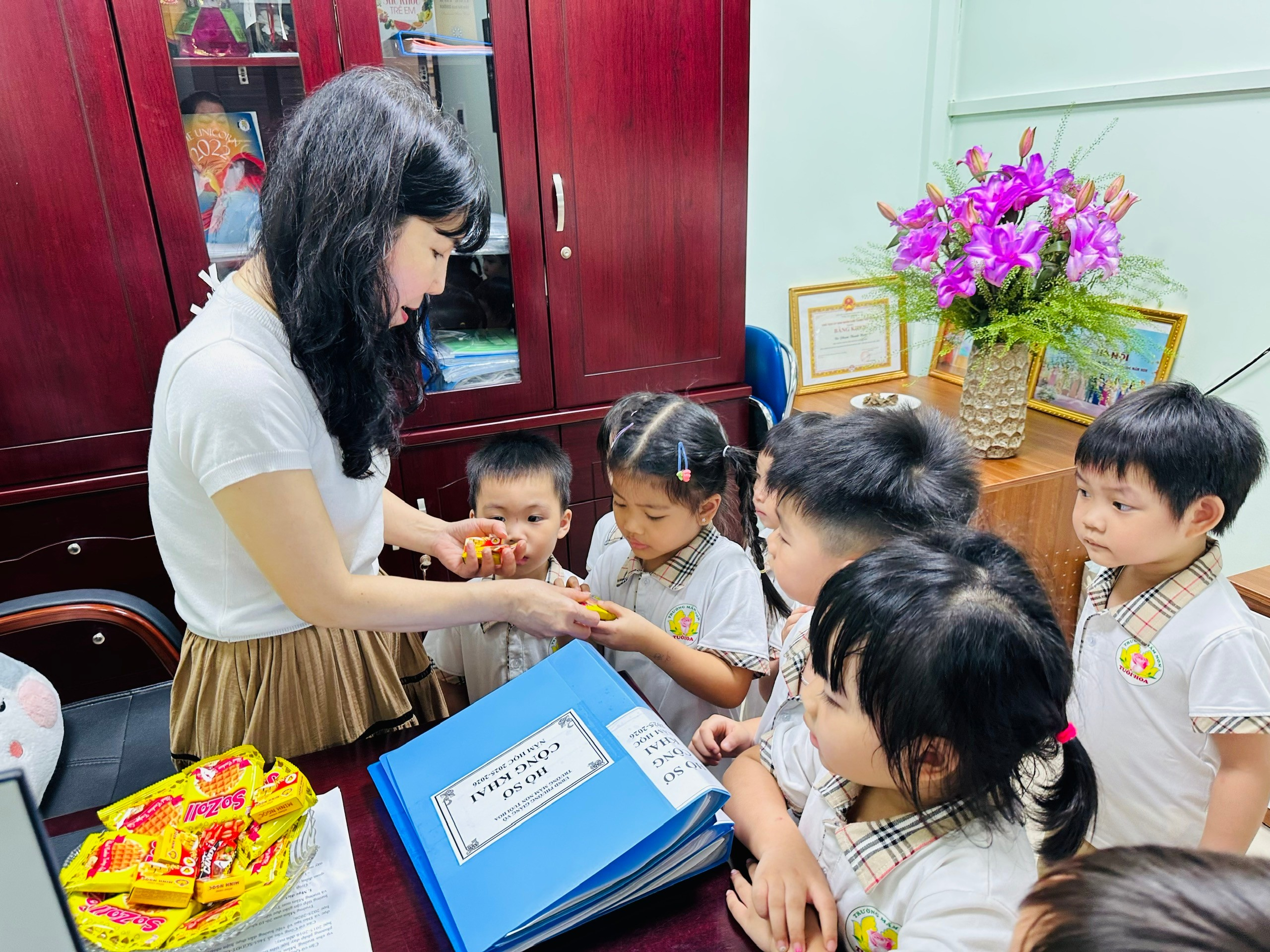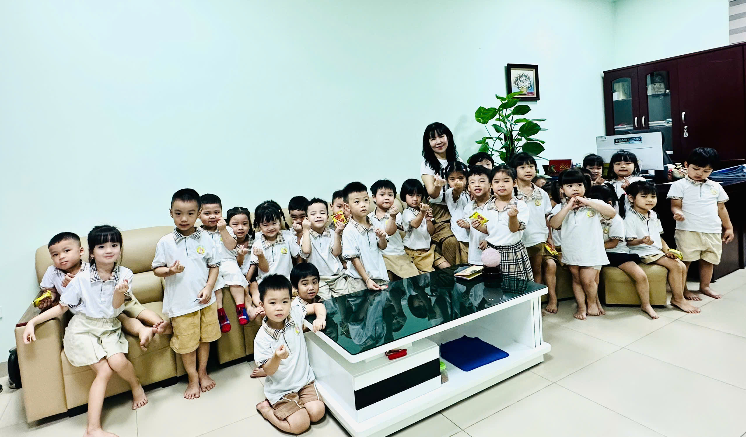 Trường mầm non chính là ngôi nhà chung thứ hai của trẻ ,ở đó không những có cô giáo thân quen và các bạn mà còn là cả một môi trường thân thiên mang tính giáo dục cao . Hôm nay các bạn nhỏ B2 cùng vào thăm phòng làm việc và trò chuyện với bác hiệu trưởng nhà trường . Các bé thật hào hứng và đầy tự tin khi trò chuyện và đưa ra những câu hỏi lý thú với bác .Không khí trong phòng náo nhiệt với nhiều câu nói của trẻ thơ " bác Hoa ơi" " bác Hoa ơi". Không khí gần gũi thân quen của bác xua tan đi cảm giác rụt rè lạ lẫm với căn phòng nhỏ . Những tiếng cười ròn tan và những câu chuyện bác kể thật ngọt ngào như những viên kẹo nhỏ bác tặng các con B2 . Yêu lắm những thiên thần nhỏ