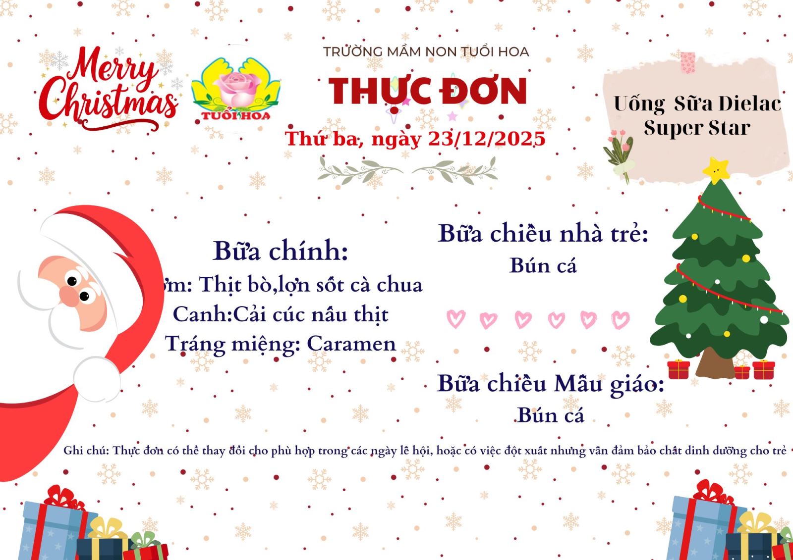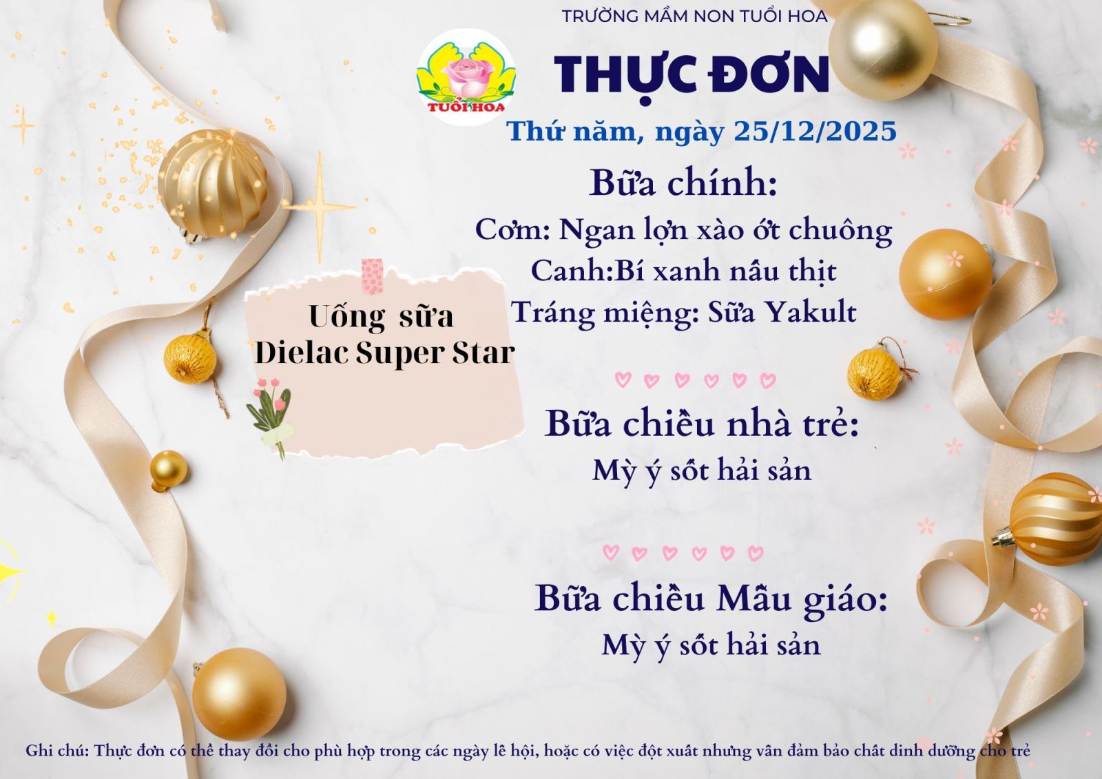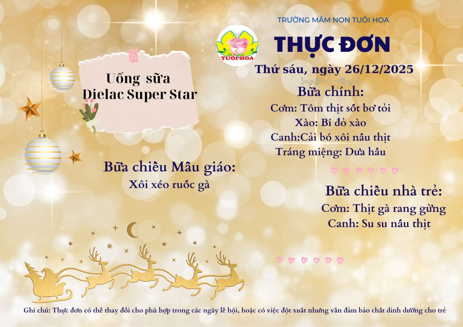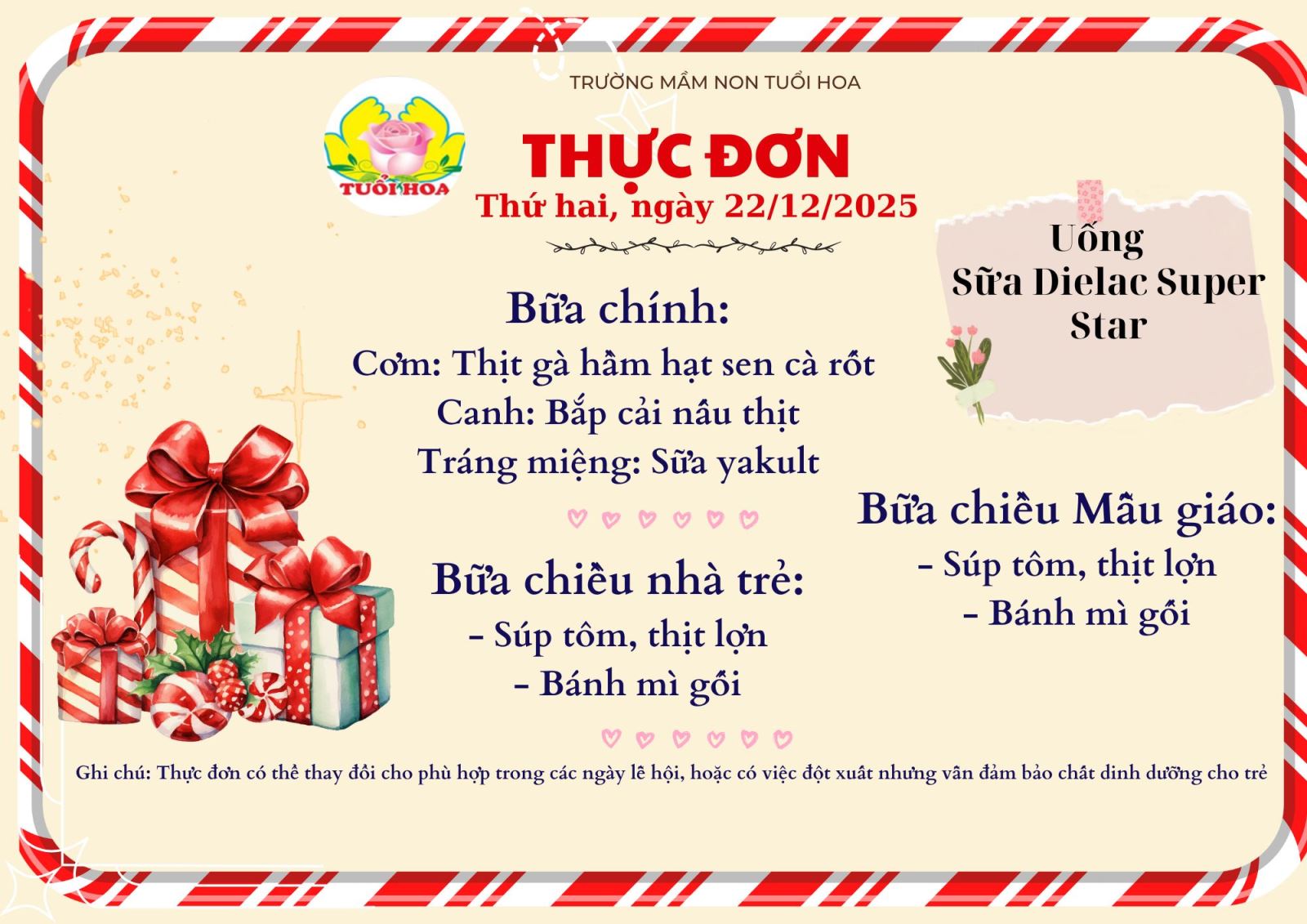 Nhằm đảm bảo các bé có những bữa ăn ngon miệng – đủ chất – an toàn, Trường Mầm non Tuổi Hoa – Giảng Võ xin trân trọng giới thiệu thực đơn dinh dưỡng trong tuần. Các món ăn được xây dựng khoa học, đa dạng, kết hợp hài hòa giữa nguồn đạm, rau củ quả và các món ăn nhẹ hấp dẫn, giúp trẻ phát triển toàn diện cả về thể chất lẫn trí tuệ.