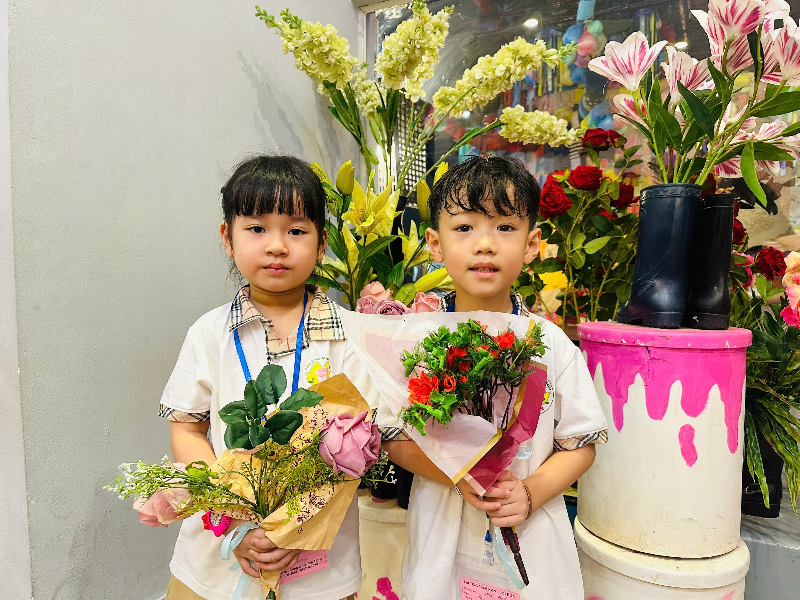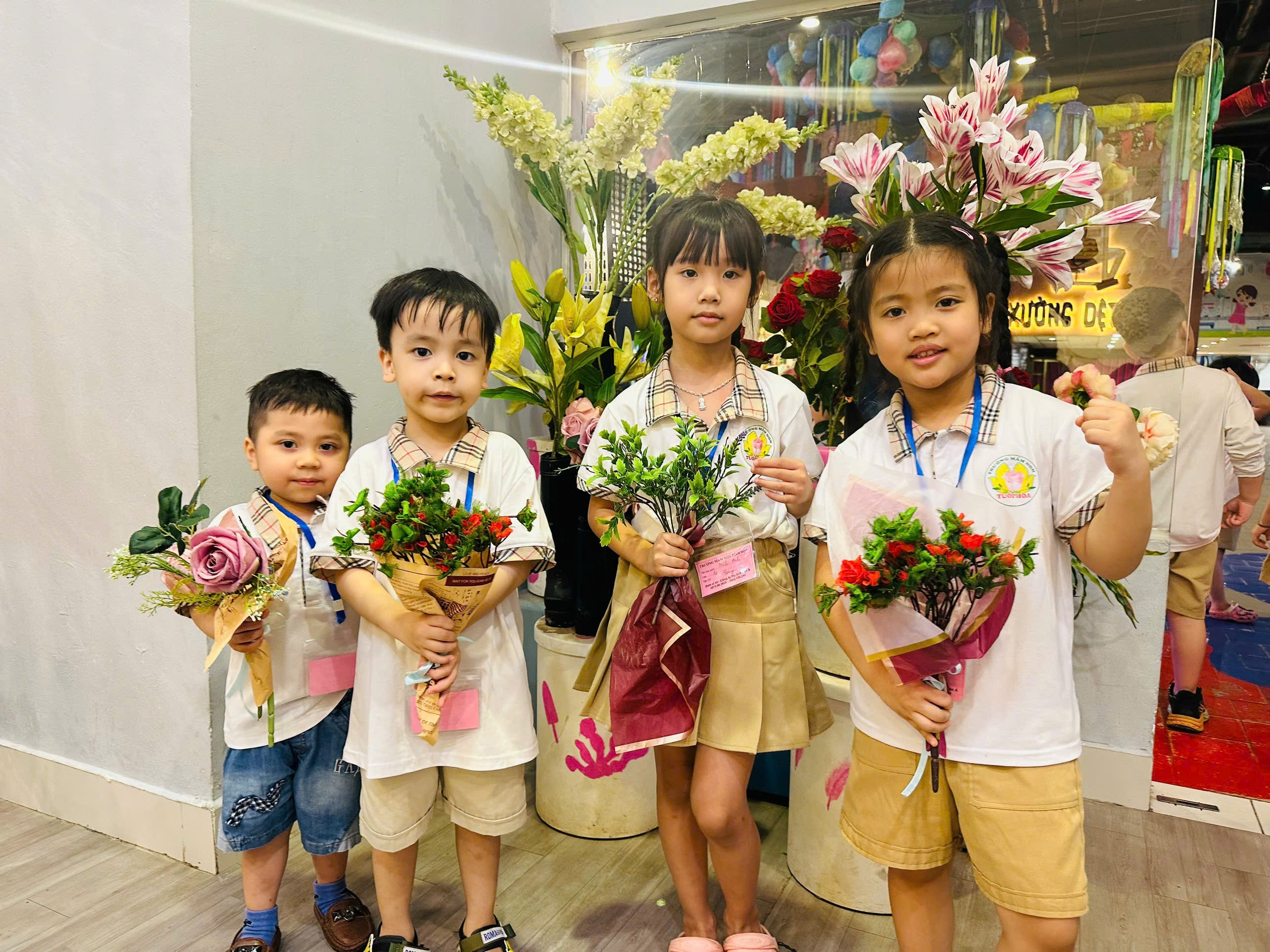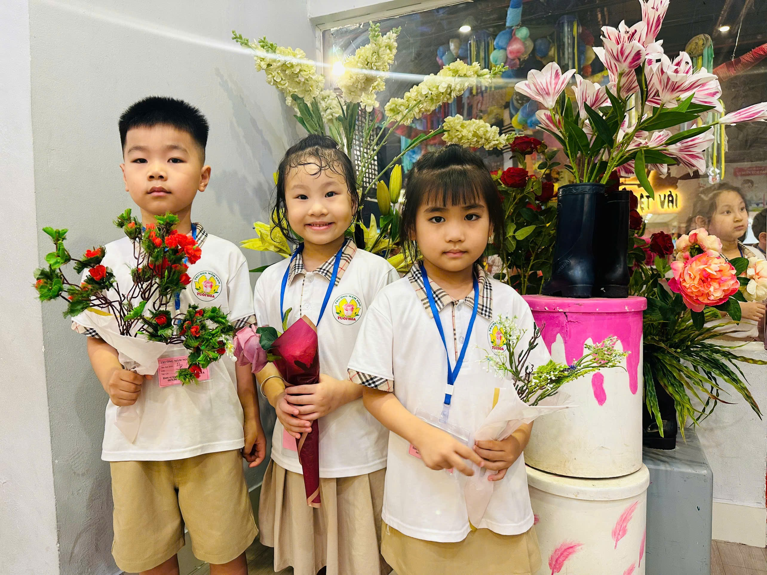 Các bé trổ tài khéo tay bó những bó hoa tươi thắm