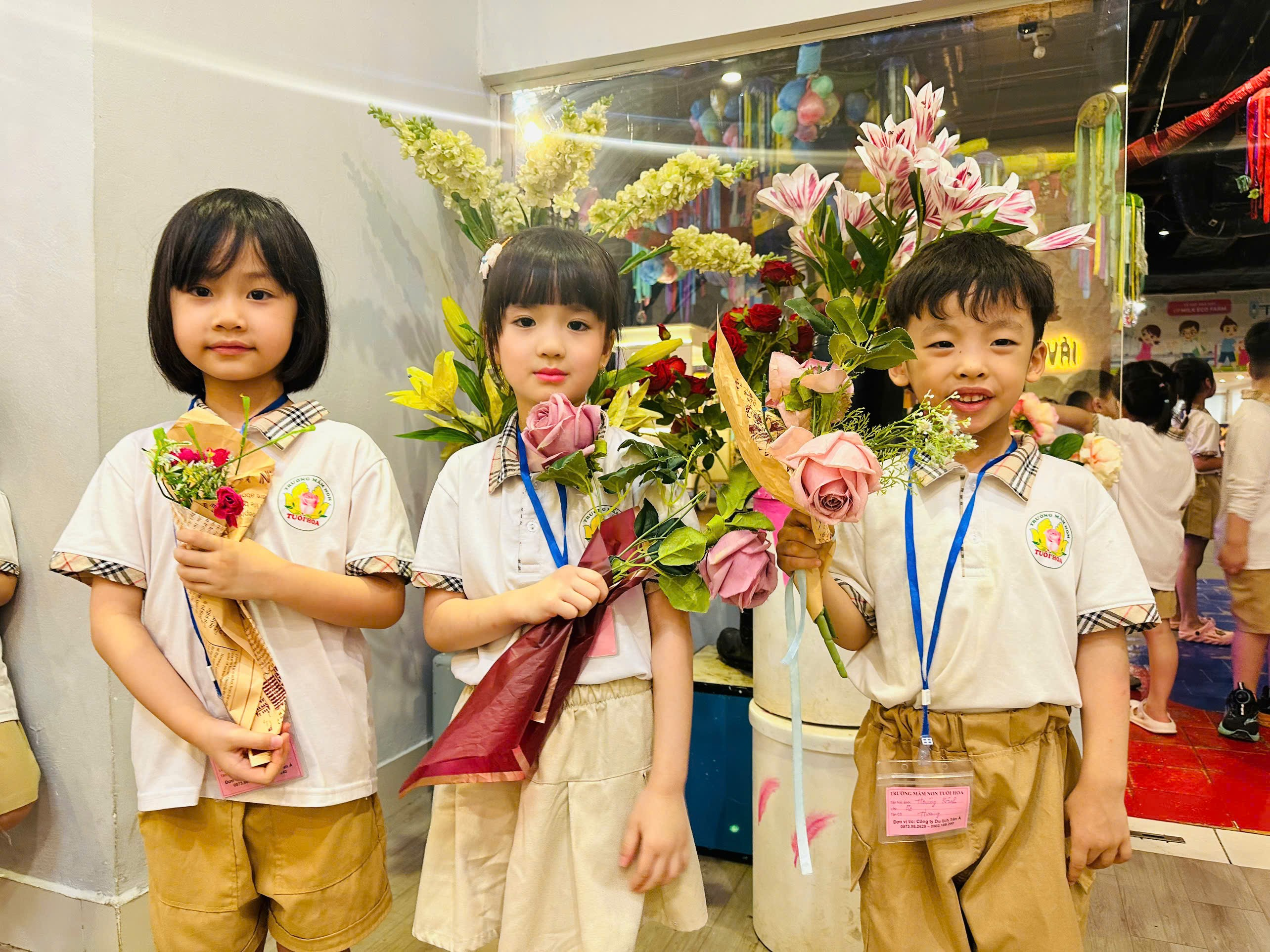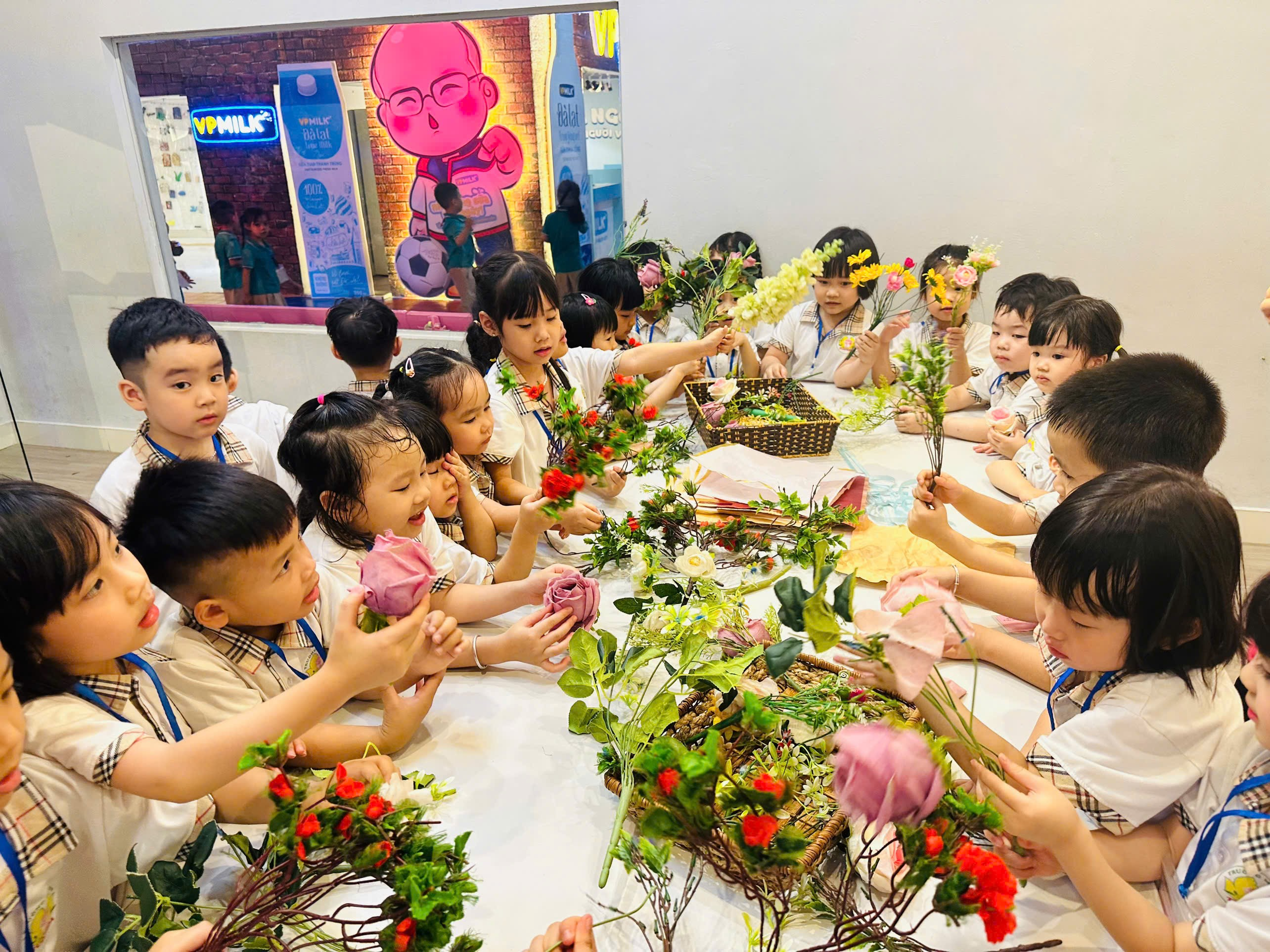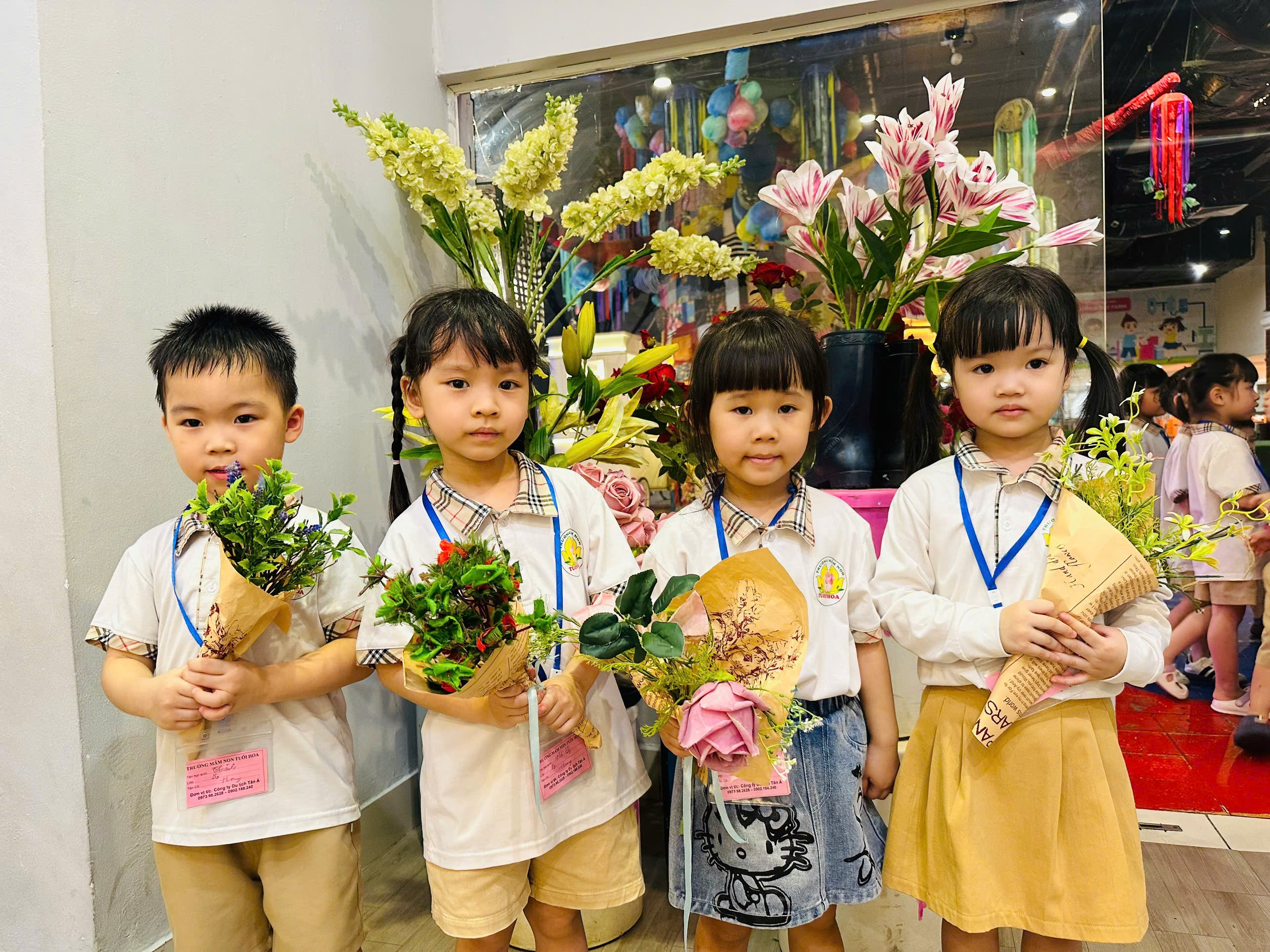 Các bé trổ tài khéo tay bó những bó hoa tươi thắm