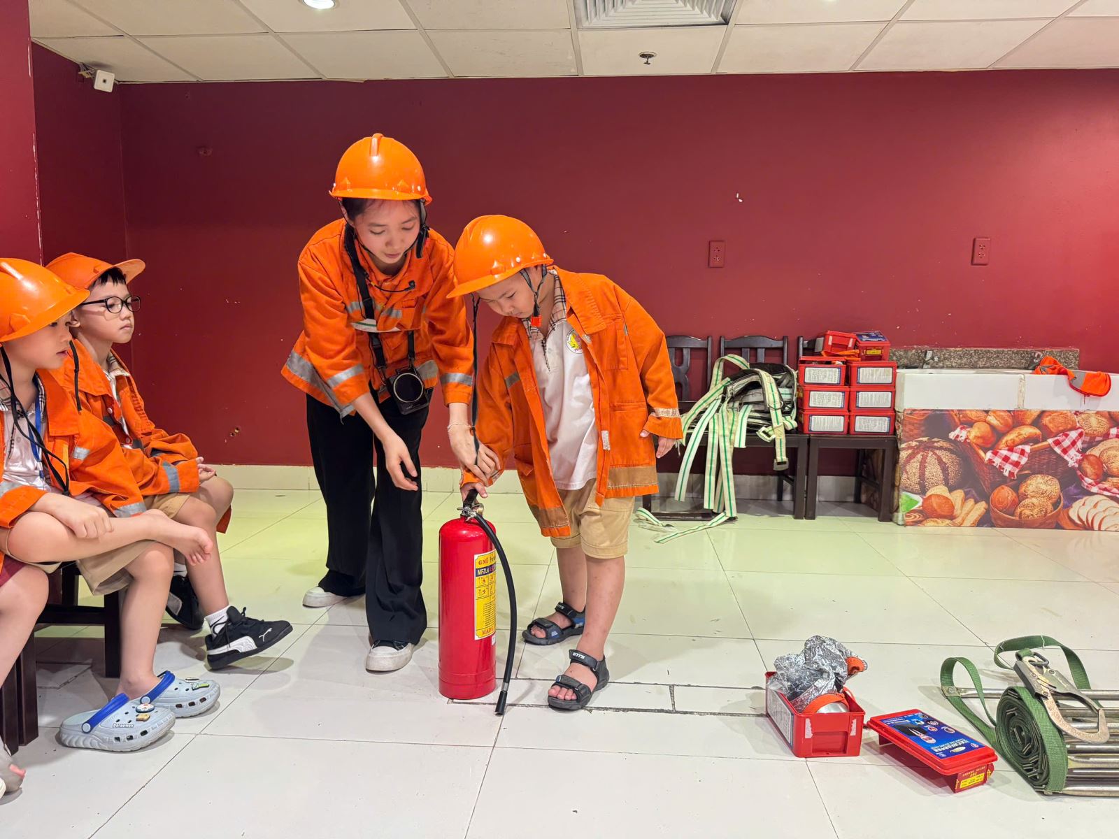 Các bé được thực hành với bình chữa cháy