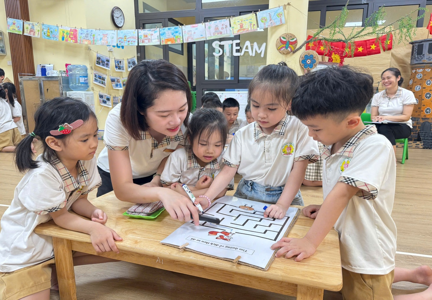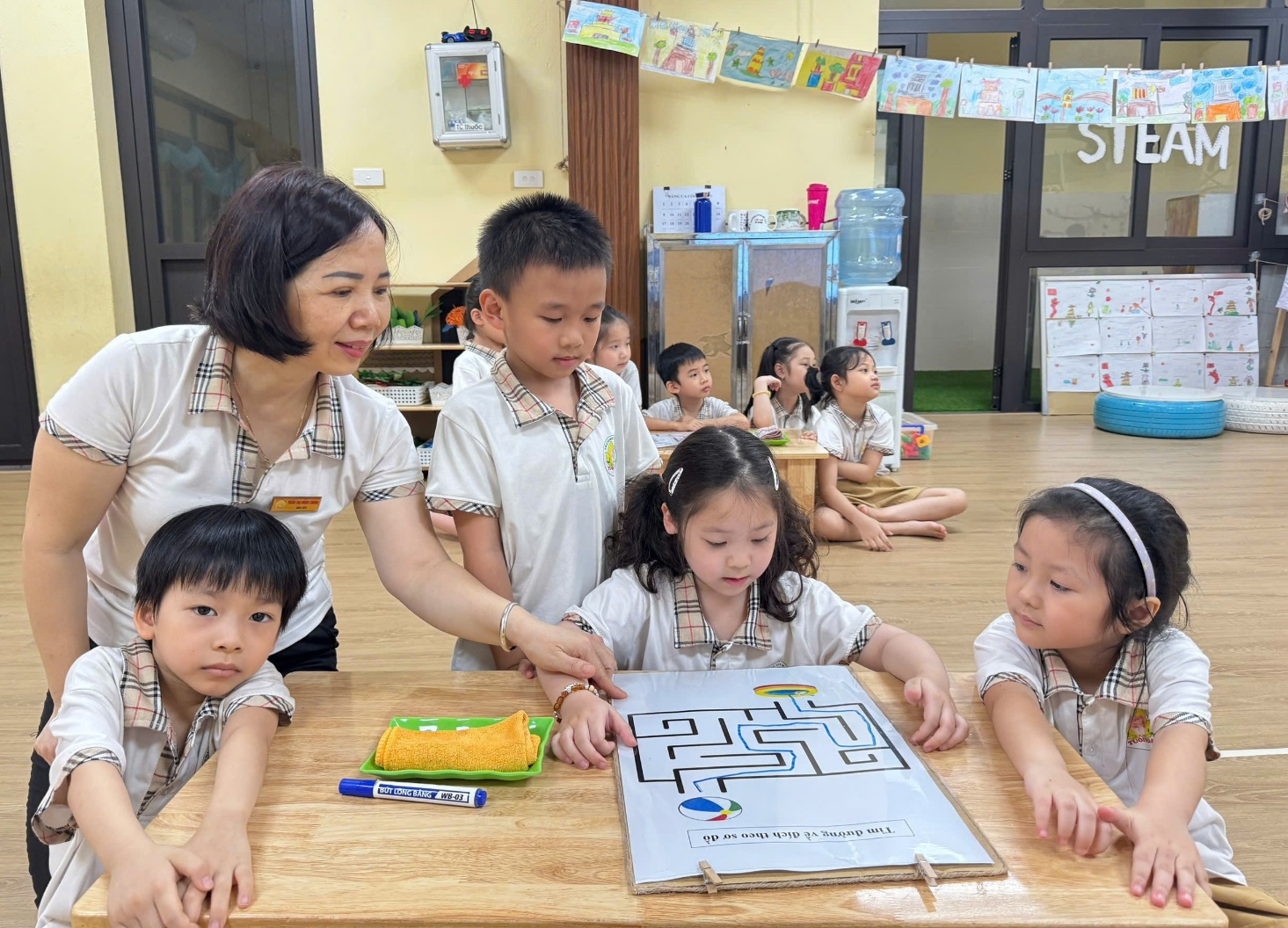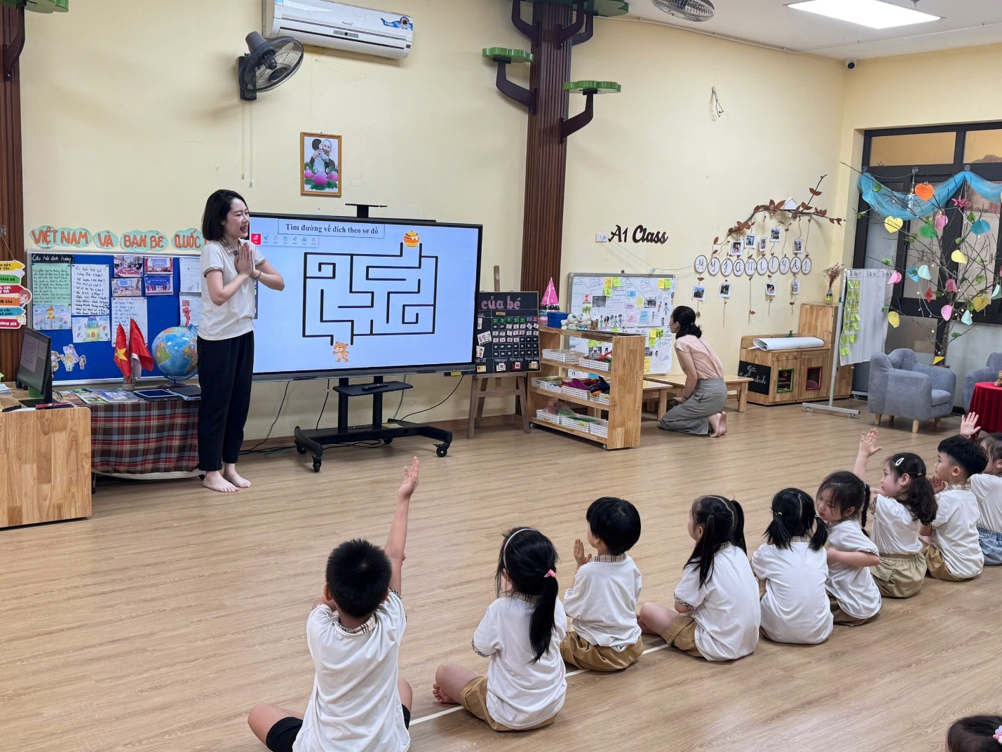 Trong việc tổ chức các hoạt động giáo dục, đội ngũ giáo viên Trường Tuổi Hoa đã thẩm thấu và vận dụng linh hoạt phương pháp dạy học kích thích tư duy vào chương trình giảng dạy lấy trẻ làm trung tâm, tư duy làm cốt lõi. Giáo viên Chuyển đổi từ "Cung cấp kiến thức cho trẻ" sang "Kích thích trẻ đặt câu hỏi": Các giờ học được thiết kế dựa trên các tình huống thực tế, thúc đẩy trẻ suy luận, phán đoán và đưa ra giải pháp sáng tạo. Kế hoạch giáo dục năm học 2025 - 2026 được điều chỉnh phù hợp với đặc điểm tâm sinh lý của trẻ, tích hợp khéo léo các kỹ thuật đặt câu hỏi gợi mở mà các cô giáo đã được học tập, trải nghiệm thực tế tại Trường CLC 20/10.